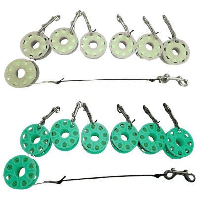 The DGX Gears Glow-In-The-Dark Finger Spool is made of luminous ABS plastic loaded with {100 ft | 30 m} of #18 ~1.5mm braided nylon line also impregnated with phosphorescent pigments and includes a 3.5 inch stainless steel double-eye bolt snap. To help prevent twisting, a stainless steel line swivel is attached between the end of the GITD line and a leader loop of black line with shrink wrapped ends. Approximate dimensions of the spool are a diameter of {3.0 in | 7.5cm} and width of {1.5 In | 3.5 cm}